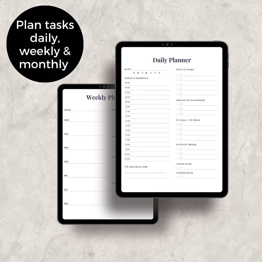 This set of digital planners will help you manage your goals and tasks throughout the next 3 years! The key to success for your business or project is getting things done now while setting (and keeping an eye on) those milestones and goals that you want to achieve. You can print it as often as you want or use digitally on Goodnotes.